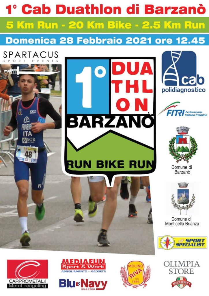 Il Duathlon sprint di Barzano’ in programma il 28 Febbraio 2021 si svolgera’ in massima sicurezza rispettando severamente il protocollo operativo attivo in periodo di Emergenza Sanitaria Covid-19.La gara che figura 1^prova del prestigioso Circuito Nazionale della Fitri si disputera’ sulle distanze di km(5podismo+20ciclismo+2,5podismo) e vede la partecipazione di tesserati agonisti di tutte le categorie d’eta’.